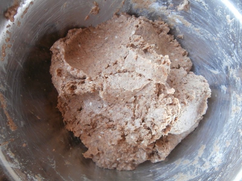 Dodaj oliwę/olej i otręby, a także dowolną ilość nasion lnu. Przesiej do masy mąkę i zagniataj ciasto, aż będzie jednolite i będzie lekko się lepić.