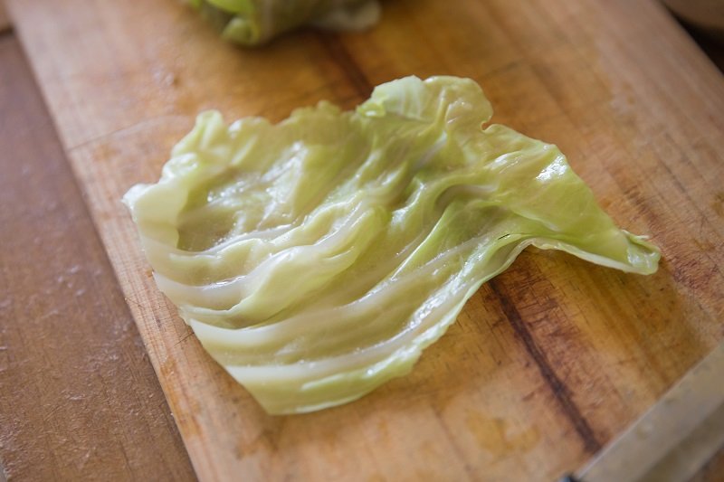 Do dużego garnka wlej wodę, posól, zagotuj. Włóż kapustę i zostaw na trzy minuty. Wyciągnij kapustę i pozostaw do wystygnięcia.