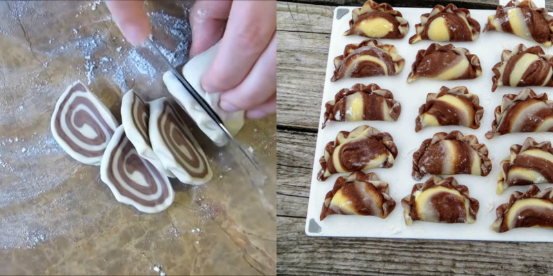 Podczas wyrabiania ciasta na pierogi podziel je na połowę i dodaj do jednej z nich kakao.
