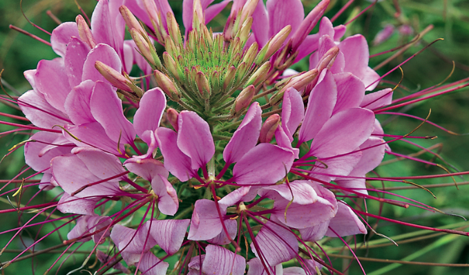Cleome, znana też jako kwiat pająka, wygląda jak żywcem wyjęta z ogrodu Alicji w Krainie Czarów. Jej delikatne, a jednocześnie spektakularne kwiaty unoszą się nad liśćmi na długich, smukłych łodygach, przyciągając wzrok z każdego kąta rabaty. No i te kolory! Od bieli przez róż po fiolet. Do wyboru, do koloru.