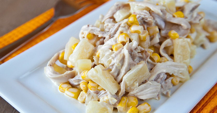 Nie należy zapominać o tym, że kurczaka w sałatce można połączyć z ananasem, dzięki czemu oba te produkty idealnie ze sobą współgrają, a także oba uwalniają swój wspaniały smak. Kukurydza z puszki, ser, cebula, pieczarki, czosnek, majonez, kurczak – sałatka gotowa!