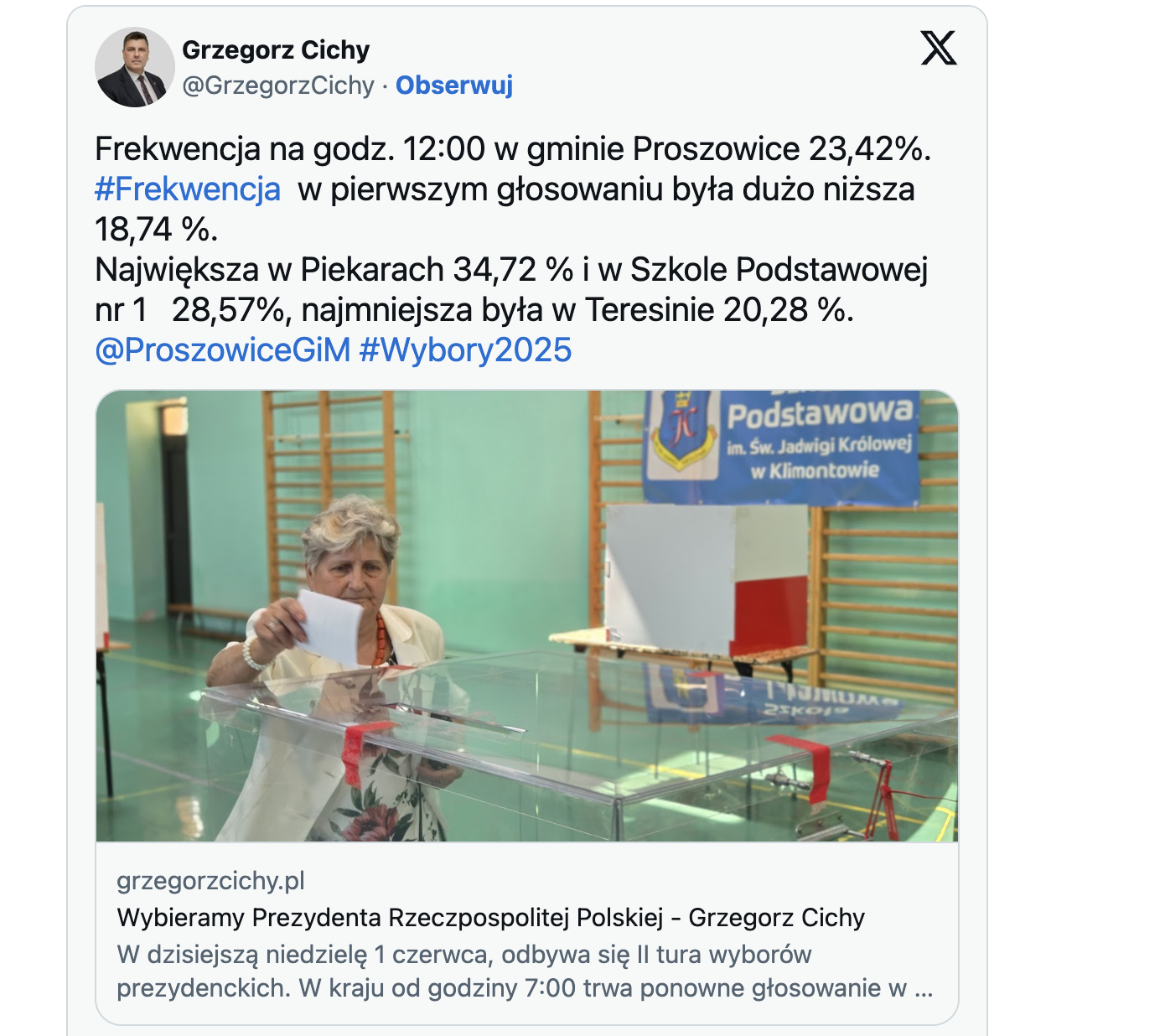PKW podała, że o godz. 12 w pierwszej turze głosowania frekwencja wyniosła 20,28%, natomiast w drugiej turze jest to już 24,83%.